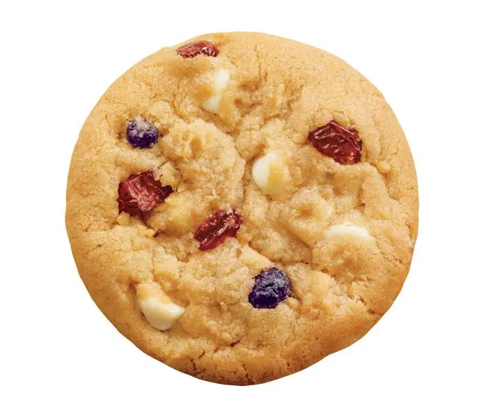 WHITE CONFECTIONERY CHIPS, SWEET DRIED BLUEBERRIES, AND TART DRIED CRANBERRIES COMBINE FOR SUCH A BLAST OF DETECTABLE FLAVOR, YOU'LL SAVOR EVERY BITE.
